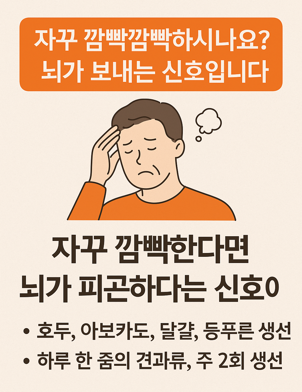 👉 하루 한 줌의 견과류, 주 2~3회 생선 섭취만으로도 뇌 건강에 큰 차이를 만들 수 있습니다.